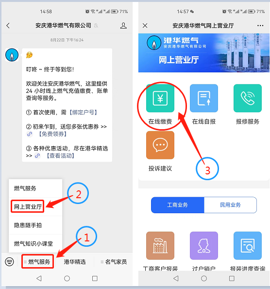 微信公眾號:關(guān)注我公司微信公眾號“安慶港華燃氣有限公司”,點擊“燃氣服務(wù)”-“網(wǎng)上營業(yè)廳”,在網(wǎng)上營業(yè)廳中選擇“在線繳費”,即可繳納燃氣費或者預(yù)存氣費。