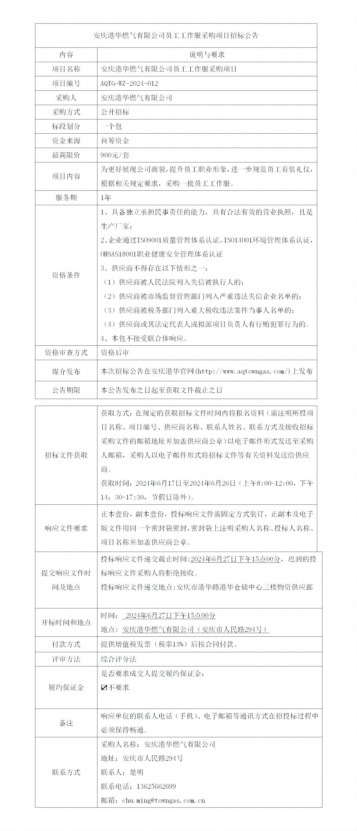 安慶港華燃?xì)庥邢薰締T工工作服采購項(xiàng)目招標(biāo)公告