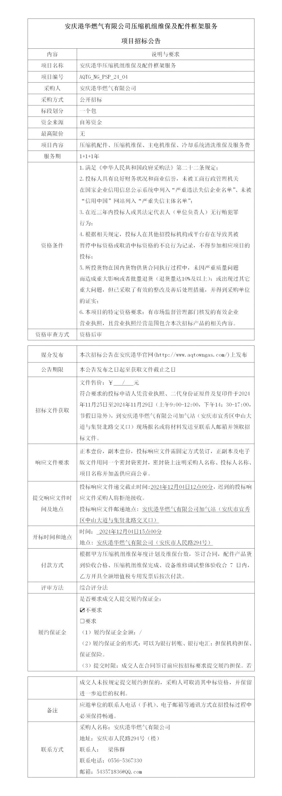安慶港華燃?xì)庥邢薰緣嚎s機(jī)組維保及配件框架服務(wù)項(xiàng)目招標(biāo)公告
