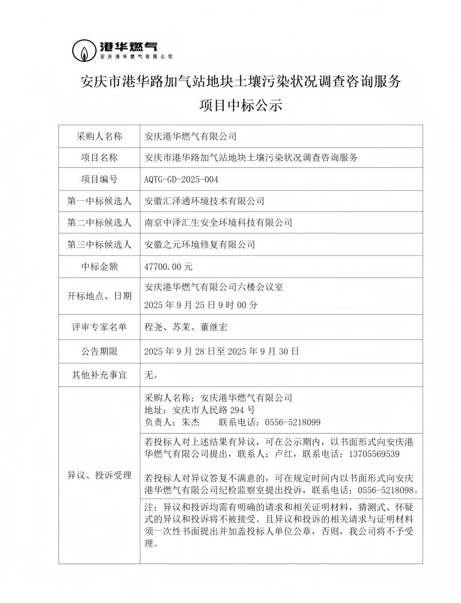 安慶市港華路加氣站地塊土壤污染狀況調(diào)查咨詢服務(wù)項(xiàng)目中標(biāo)公示