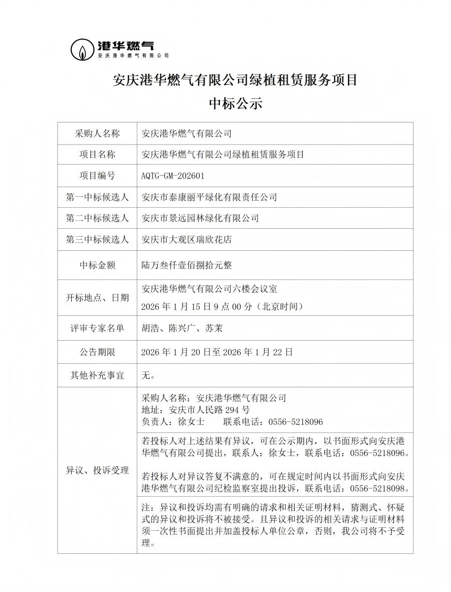 安慶港華燃?xì)庥邢薰揪G植租賃服務(wù)項目中標(biāo)公示