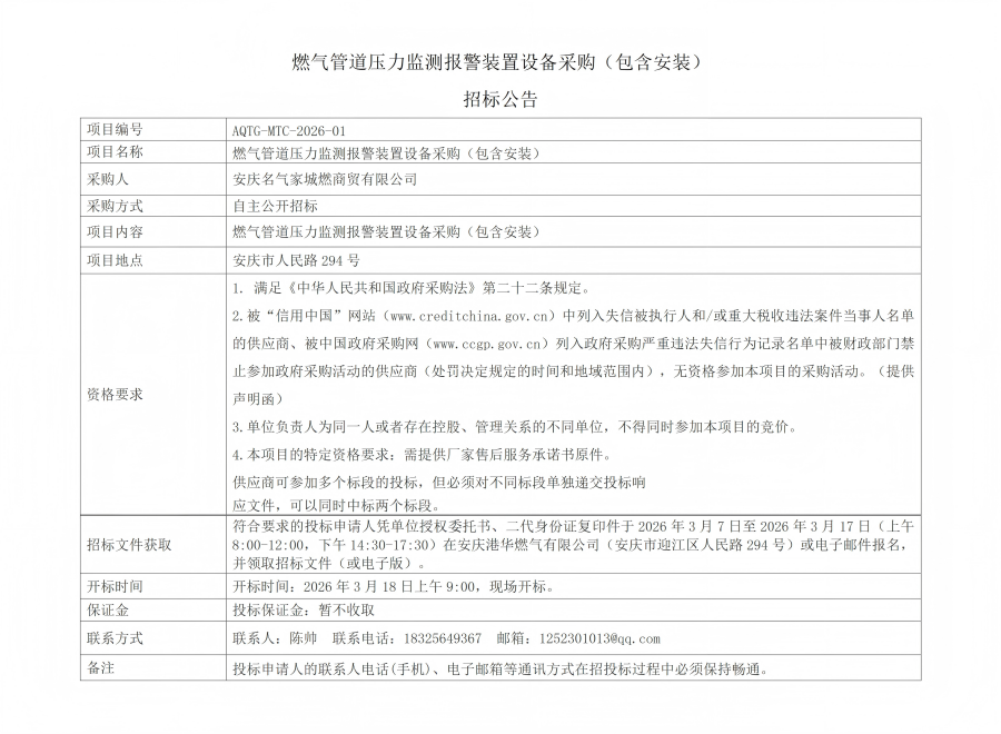 燃?xì)夤艿缐毫ΡO(jiān)測報(bào)警裝置設(shè)備采購(包含安裝)招標(biāo)公告