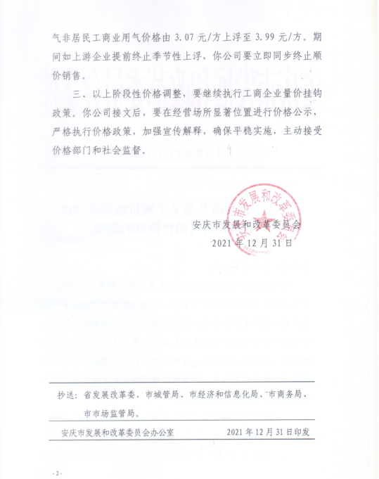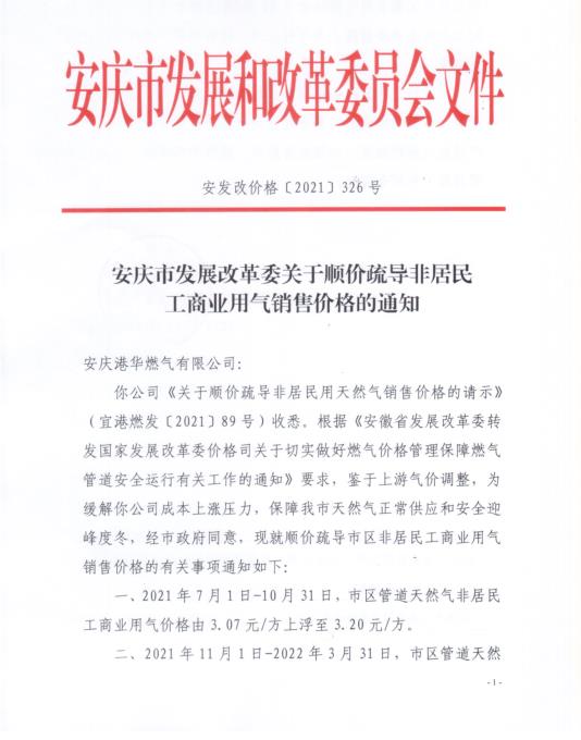 安慶市發(fā)展改革委關(guān)于順價疏導(dǎo)冬季非居民工商業(yè)用氣價格的通知(2021)