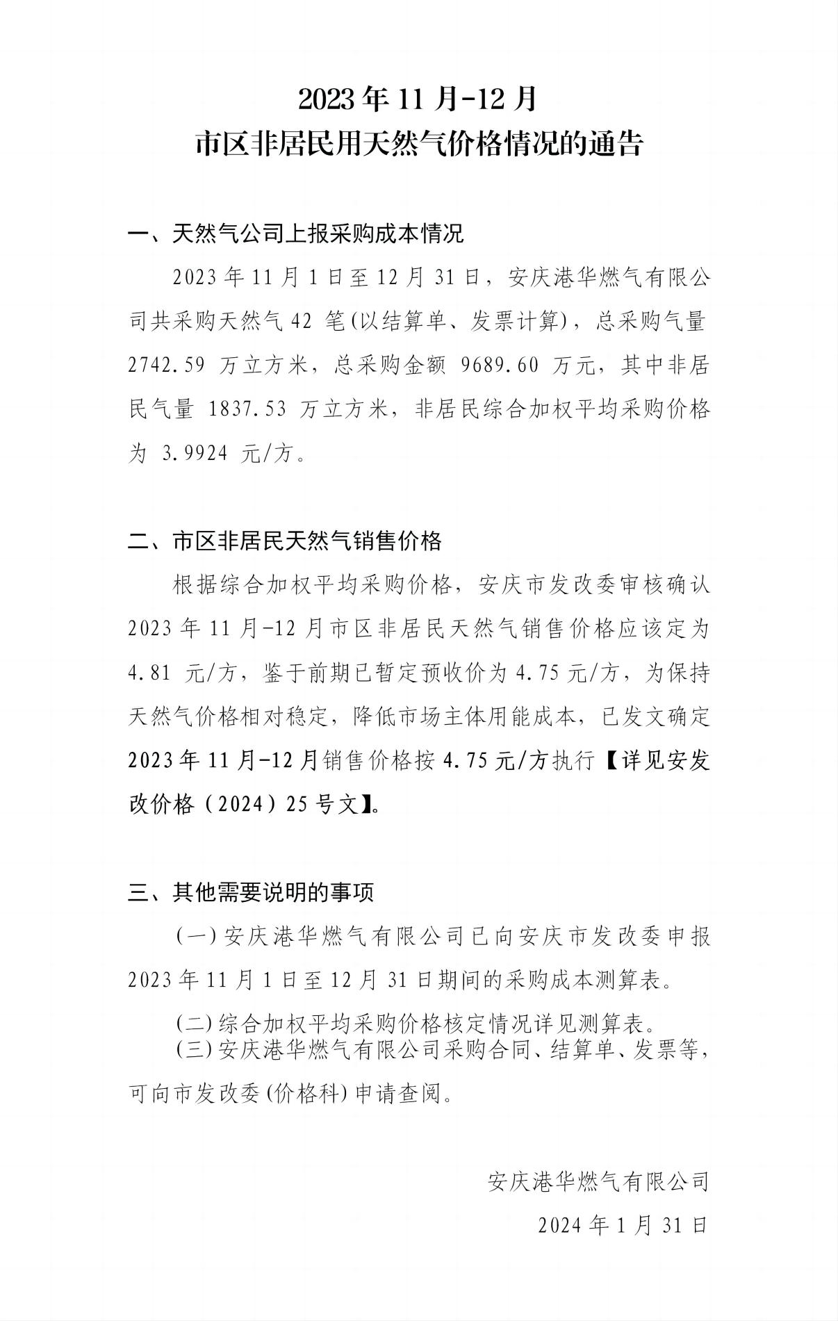 關(guān)于明確安慶市區(qū)2023年第四季度天然氣價格和2024年第一季度非居民天然氣暫定價格有關(guān)事項的通知